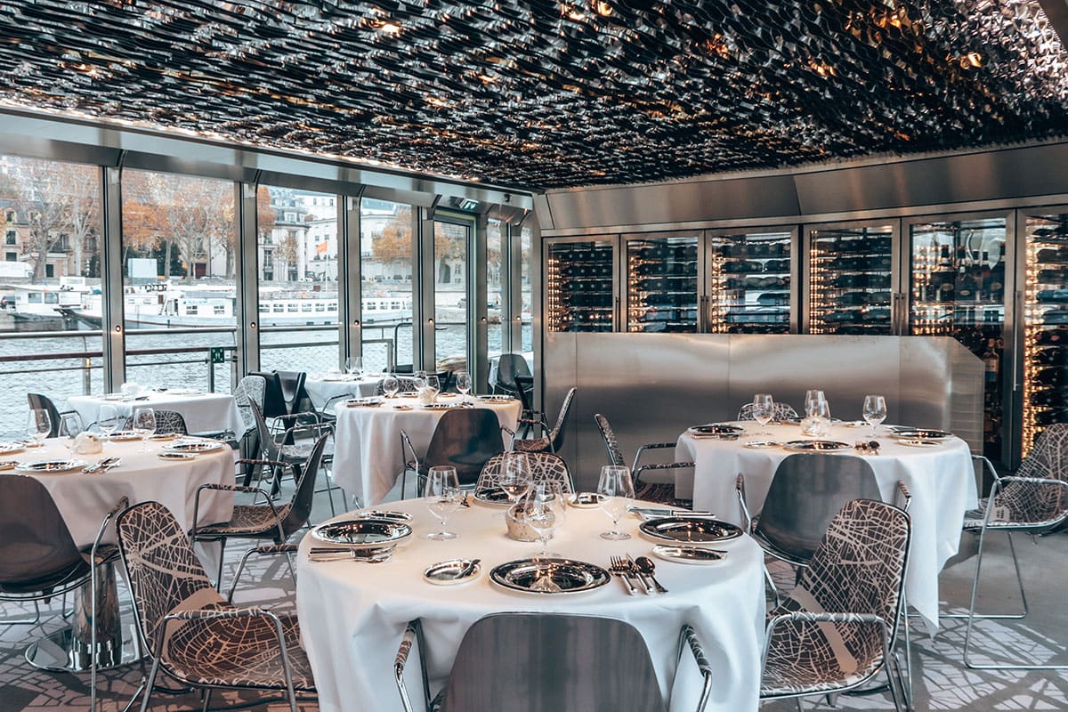 Wat deze rondvaart over de Seine extra bijzonder maakt, is het feit dat het restaurant gebouwd is op een elektrische boot die maar liefst 38 meter lang is. Niet alleen heel milieuvriendelijk maar ook nog eens ontzettend geruisloos. Je hoeft dus niet bang te zijn dat je elkaar tijdens het eten niet kunt verstaan of dat je de wateren van Parijs vervuilt. Bovendien voelt de boot ook heel stabiel aan waardoor je bijna niet het idee hebt dat je je op het water begeeft. Al doet de passerende Notre-Dame en het Louvre je wel iets vermoeden uiteraard.