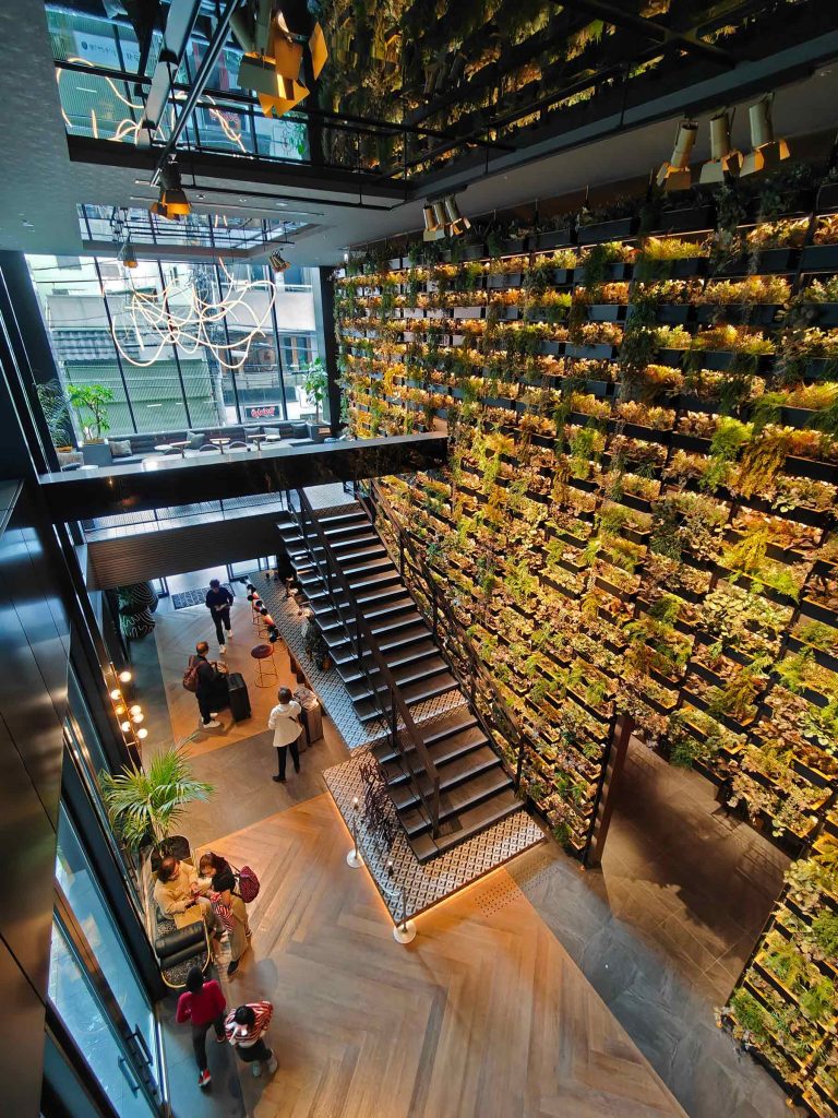De wijk achter het hotel is na de vroegere houtskoolhandel flink veranderd. Sinds de jaren ’70 zijn de rustige pakhuizen getransformeerd tot hippe cafés, boetieks, woonhuizen en kunstateliers. Deze frisse wind waait vandaag de dag ook door het hotel. Het is een hotel met een hoog fun-gehalte dat reizigers van over de hele wereld aanspreekt. De gigantisch wanden met planten in de lobby zijn een echte blikvanger en de kleine binnentuin maken het hotel tot een groene oase in het hart van Osaka.