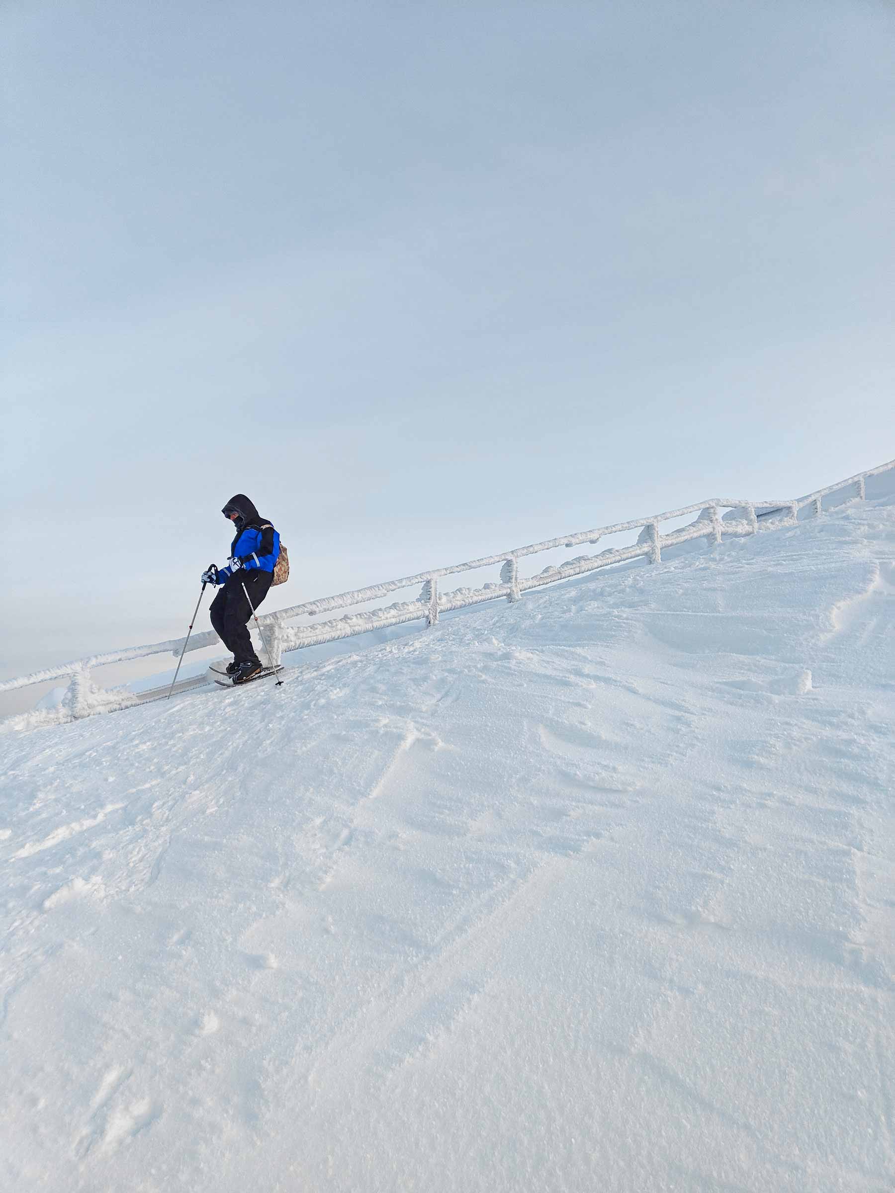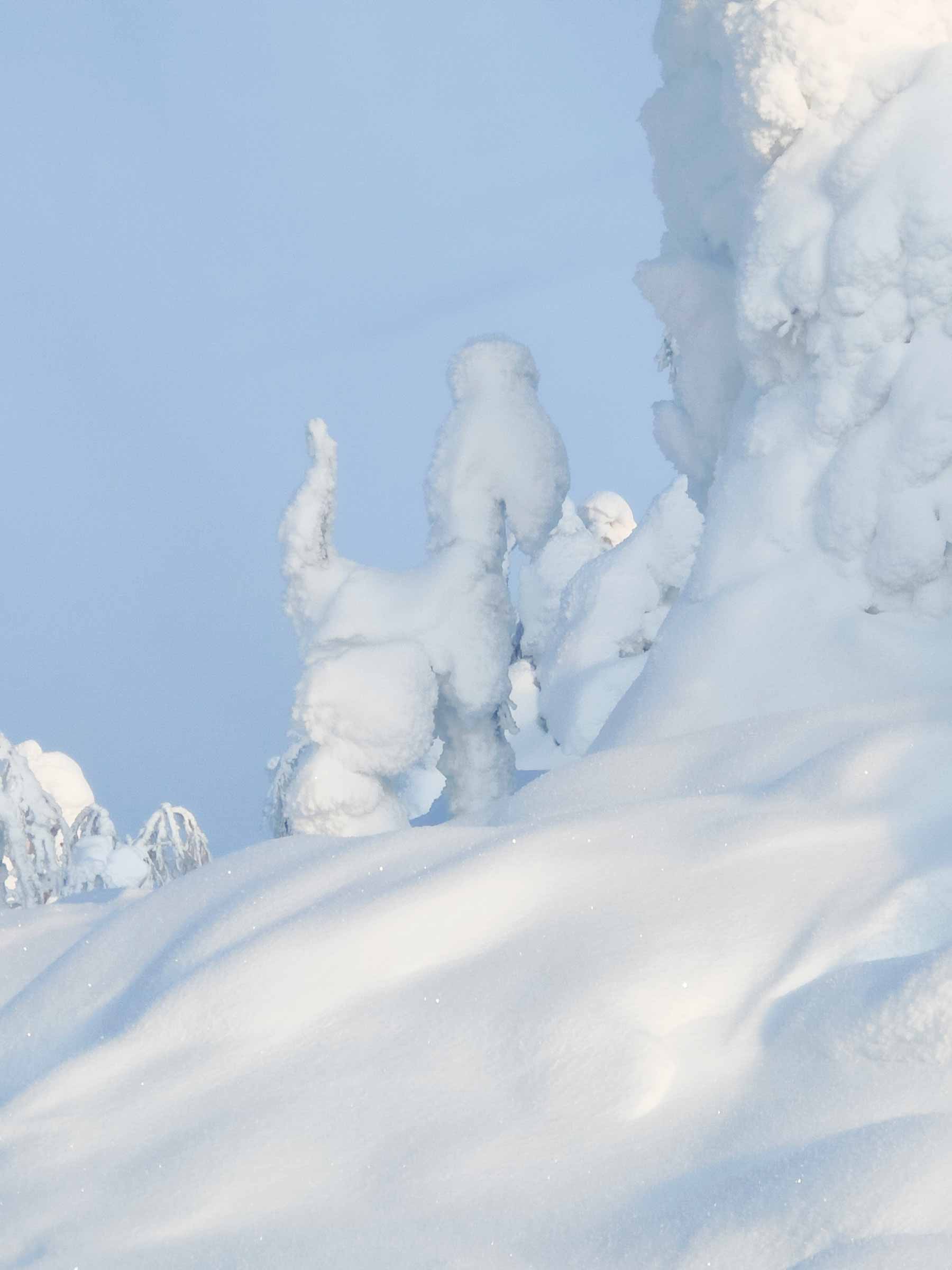 De wandeling door het bos en het uitzicht vanaf de top is adembenemend mooi. Door de rust die je hier ervaart kun je tijdens de hike in een soort meditatieve staat komen. Onderweg hoor je niets anders dan de wind en het gekraak van ijs onder je sneeuwschoenen. De bomen met hun besneeuwde takken buigen onder het gewicht van de sneeuw en hierdoor worden er talloze fantasiefiguren gevormd. Zie jij bijvoorbeeld op de foto linksonder ook een poedel?