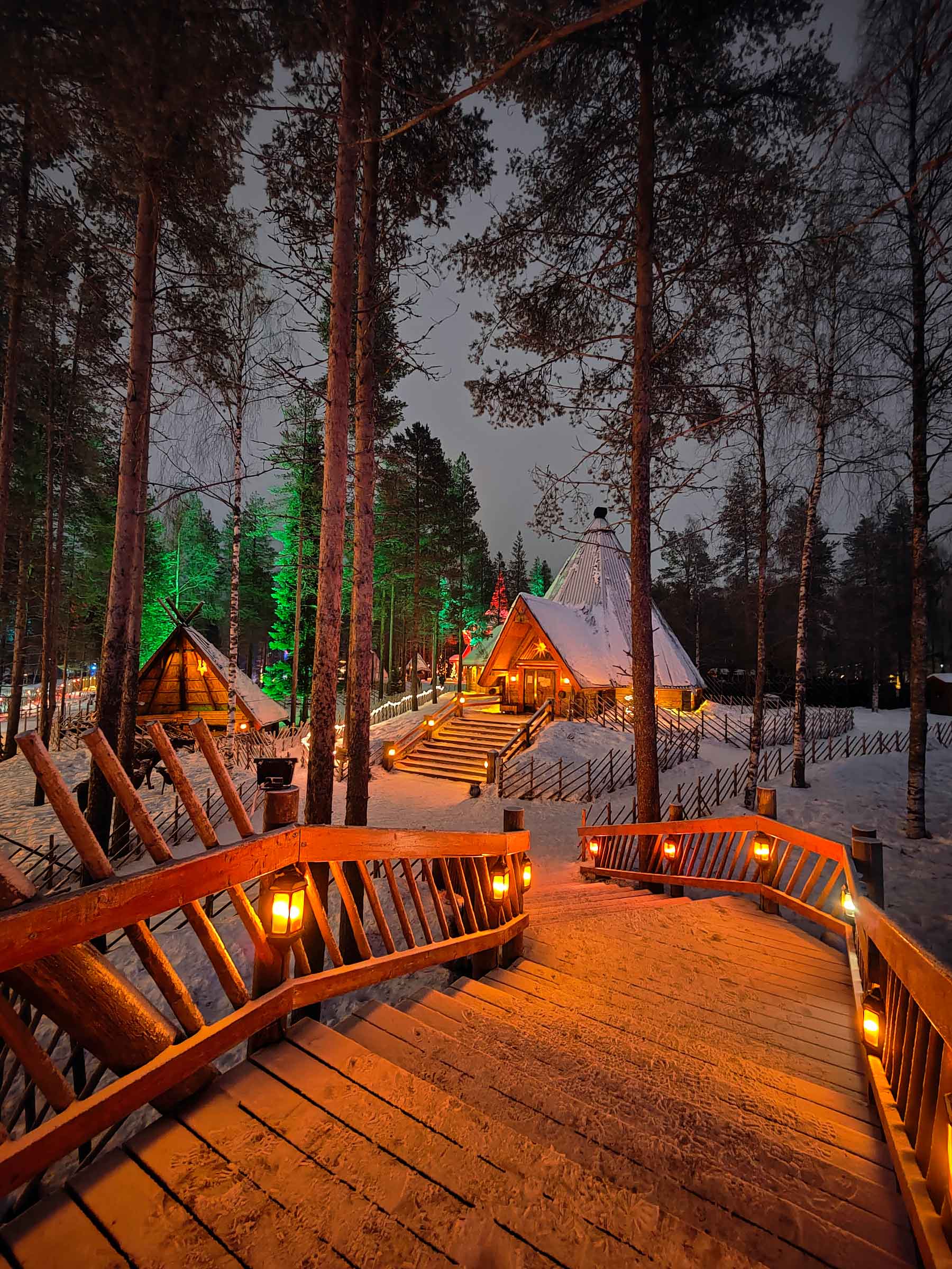 ‘S avonds is vrijwel alles dicht in Santa Claus Village en ligt de Kerstman al onder de wol. Toch blijft de sfeervolle kerstverlichting aan en omdat het park gratis toegankelijk is kun je er nog wel een foto op de poolcirkel maken of met een beetje geluk het noorderlicht fotograferen. Je kunt er ook overnachten in onderstaande accommodaties, die allemaal op of om het terrein van Santa Claus Village liggen: